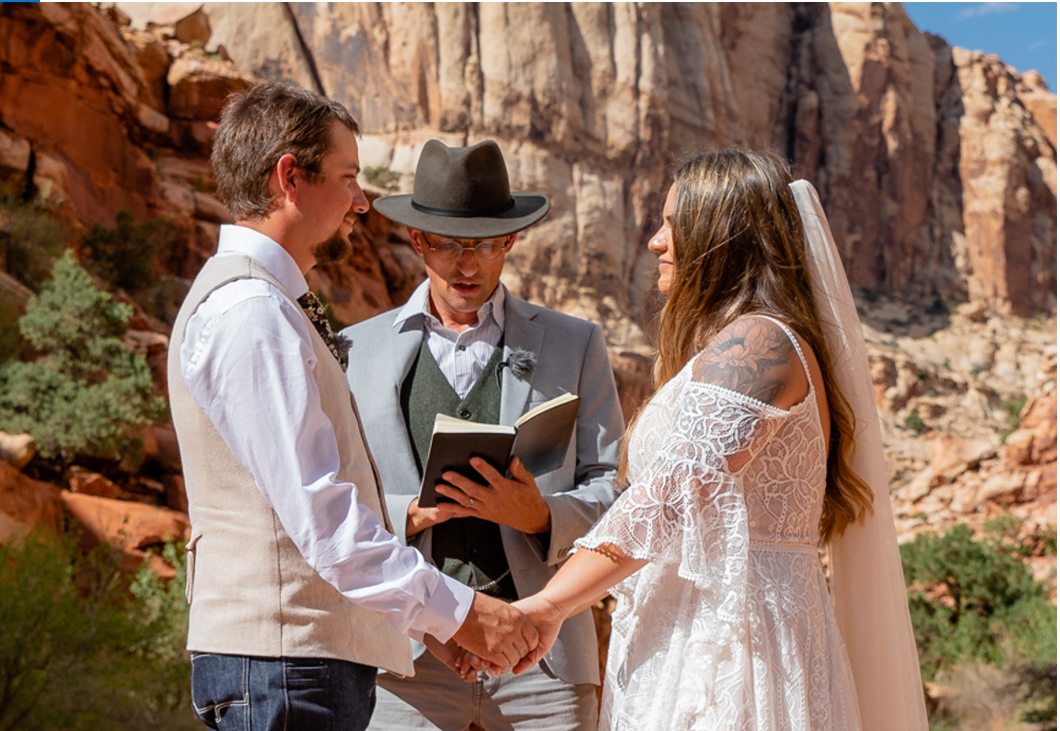 Outdoor wedding ceremony with officiant wearing a black hat and suit, and a man in formal attire, with red rock cliffs in the background. Near Zion National Park in Utah